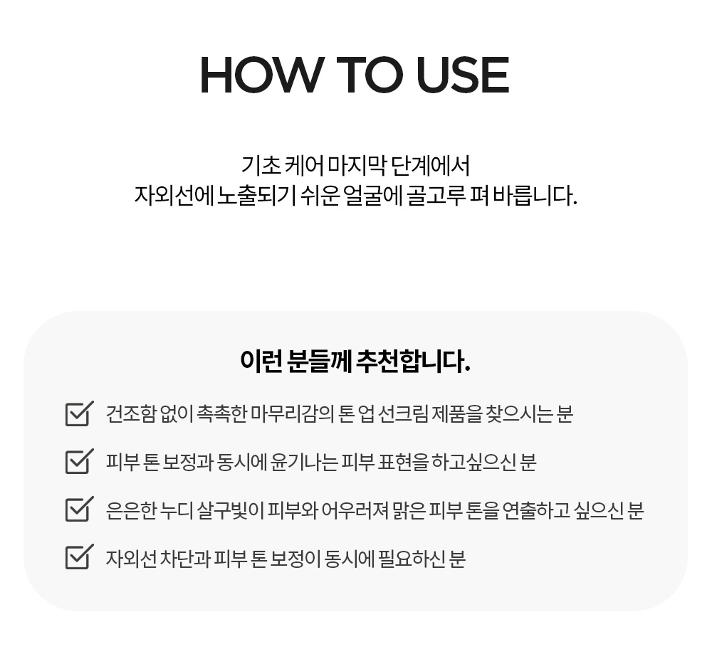 | »ç¿ë¹æ¹ý | ±âÃÊ ¼ÕÁú ¸¶Áö¸· ´Ü°è¿¡¼ ¾ó±¼°ú ¸ñ, ÆÈ, ´Ù¸® µî Àڿܼ±¿¡ ³ëÃâµÇ±â ½¬¿î ÇǺο¡ °ñ°í·ç ¹ß¶óÁÝ´Ï´Ù. |