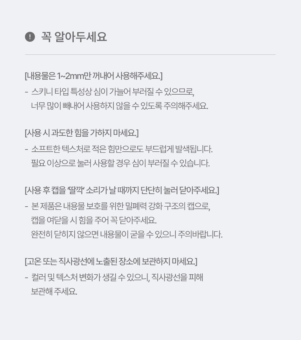| »ç¿ëÇÒ ¶§ÀÇ ÁÖÀÇ»çÇ× | °¡. ÈÀåǰ »ç¿ë ½Ã ¶Ç´Â »ç¿ë ÈÄ Á÷»ç±¤¼±¿¡ ÀÇÇÏ¿© »ç¿ëºÎÀ§°¡ ºÓÀº ¹ÝÁ¡, ºÎ¾î¿À¸§ ¶Ç´Â °¡·Á¿òÁõ µîÀÇ ÀÌ»ó Áõ»óÀ̳ª ºÎÀÛ¿ëÀÌ ÀÖ´Â °æ¿ì¿¡´Â Àü¹®ÀÇ µî°ú »ó´ãÇÒ °Í ³ª. »óó°¡ ÀÖ´Â ºÎÀ§ µî¿¡´Â »ç¿ëÀ» ÀÚÁ¦ÇÒ °Í ´Ù. º¸°ü ¹× Ãë±Þ ½Ã ÁÖÀÇ»çÇ× 1) ¾î¸°ÀÌÀÇ ¼ÕÀÌ ´êÁö ¾Ê´Â °÷¿¡ º¸°üÇÒ °Í 2) Á÷»ç±¤¼±À» ÇÇÇØ¼ º¸°üÇÒ °Í ¶ó. ´«¿¡ µé¾î°¬À» ¶§¿¡´Â Áï½Ã ¾Ä¾î³¾ °Í |